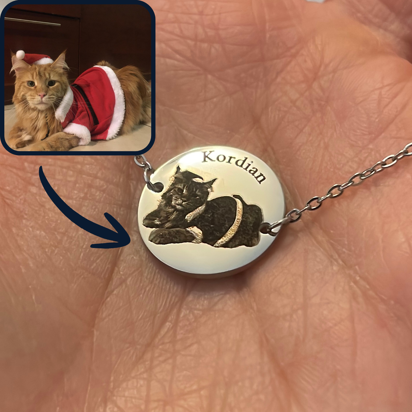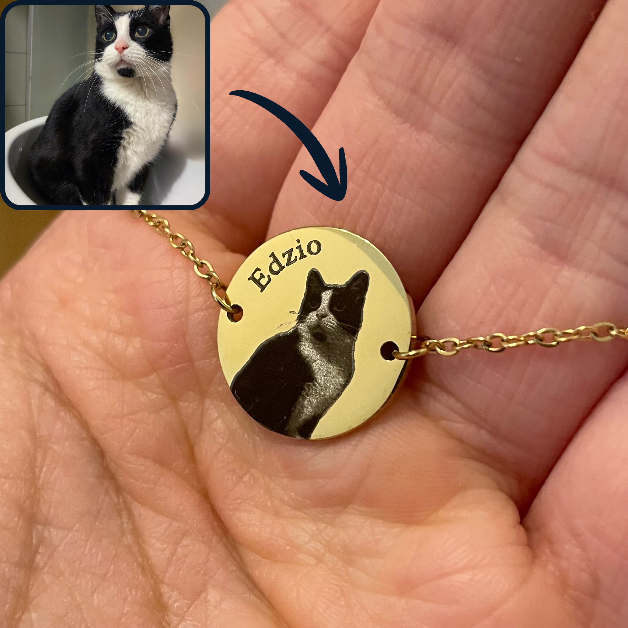 🤍 Personalizacja: grawer dwustronny (1 strona — zdjęcie pupila + imię, 2 strona — dowolny tekst)