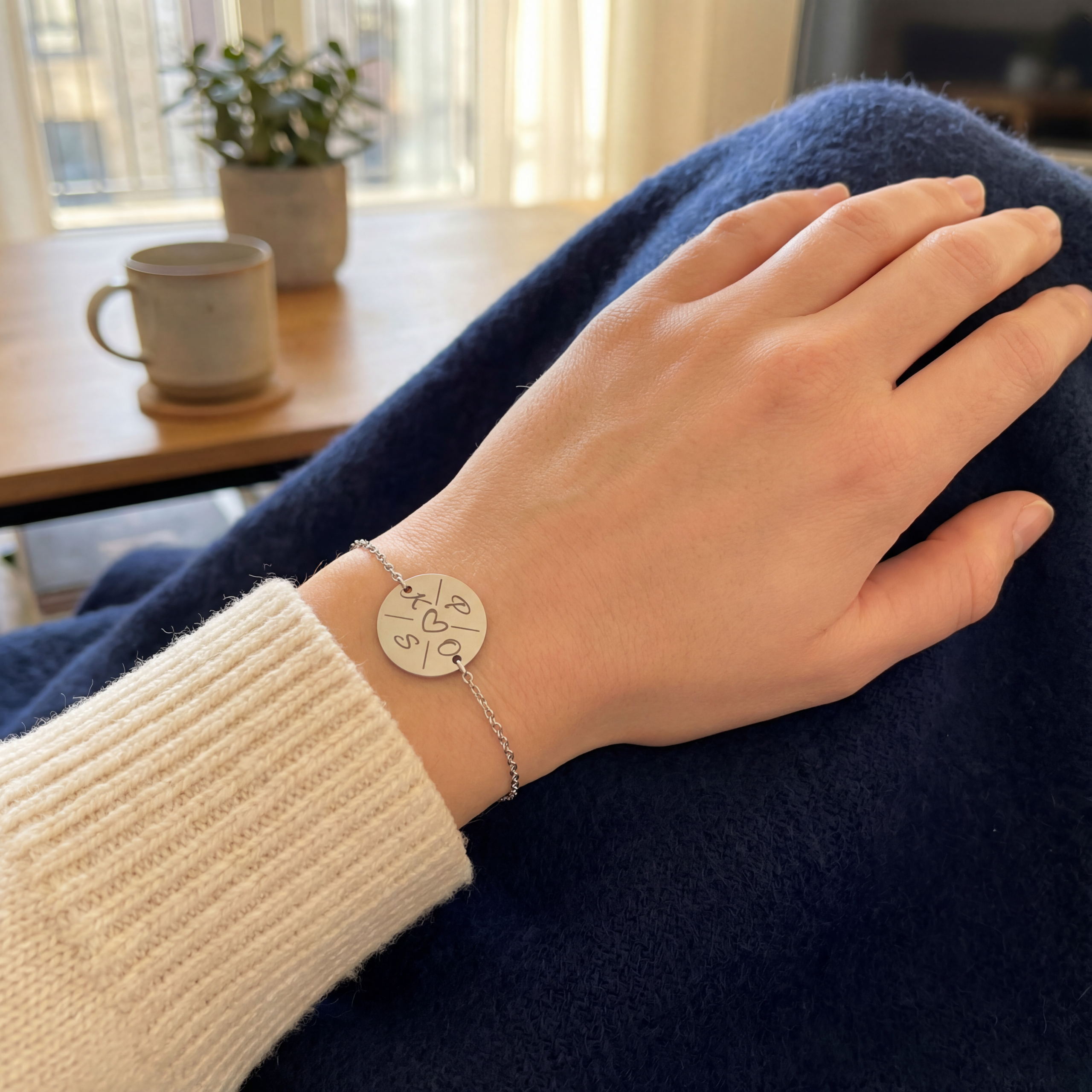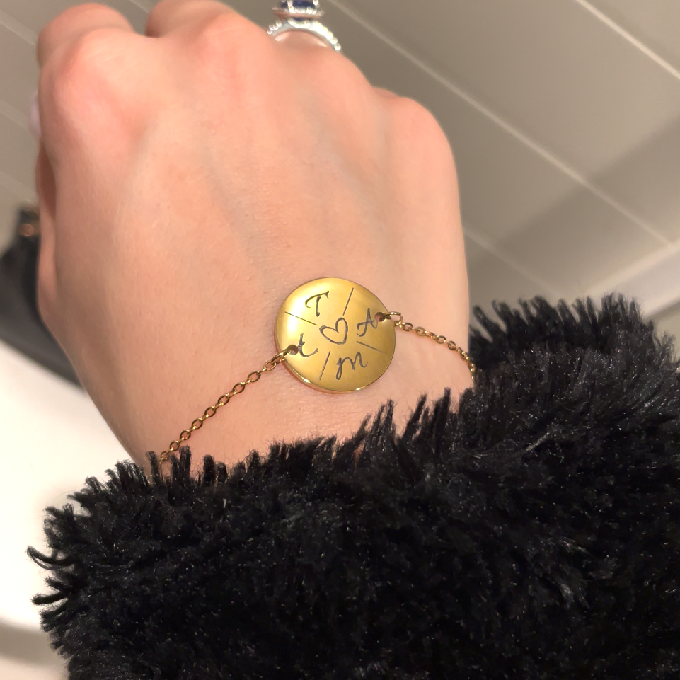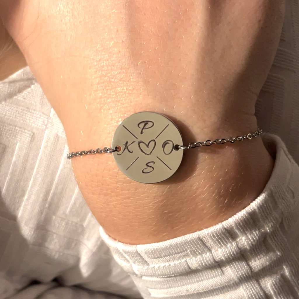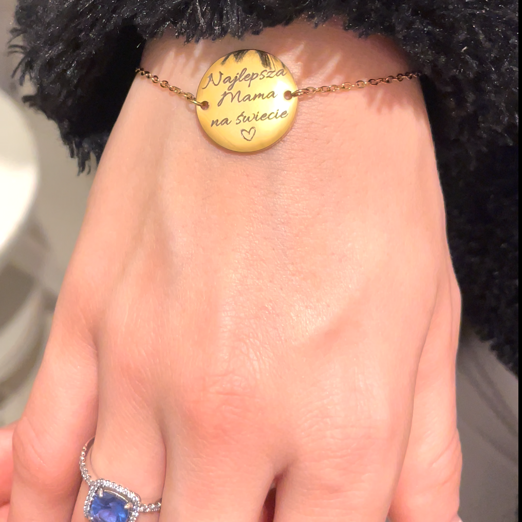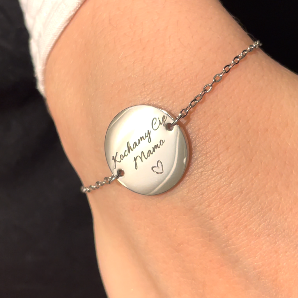 Bransoletka łączy elegancję z osobistym znaczeniem – na jednej stronie znajdują się inicjały bliskich osób wokół serca, symbolizującego miłość i więź, która daje poczucie bliskości i wsparcia. Druga strona pozwala na umieszczenie własnego tekstu, np. „Najlepsza mama na świecie”, ważnej daty lub krótkiej dedykacji, dzięki czemu biżuteria staje się wyjątkową pamiątką pełną emocji, wzruszenia i codziennego przypomnienia o tym, co najważniejsze.